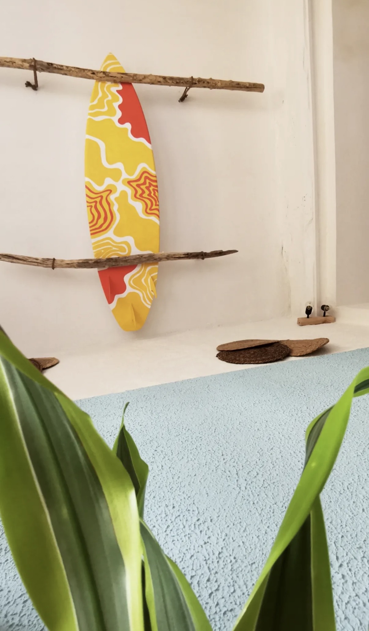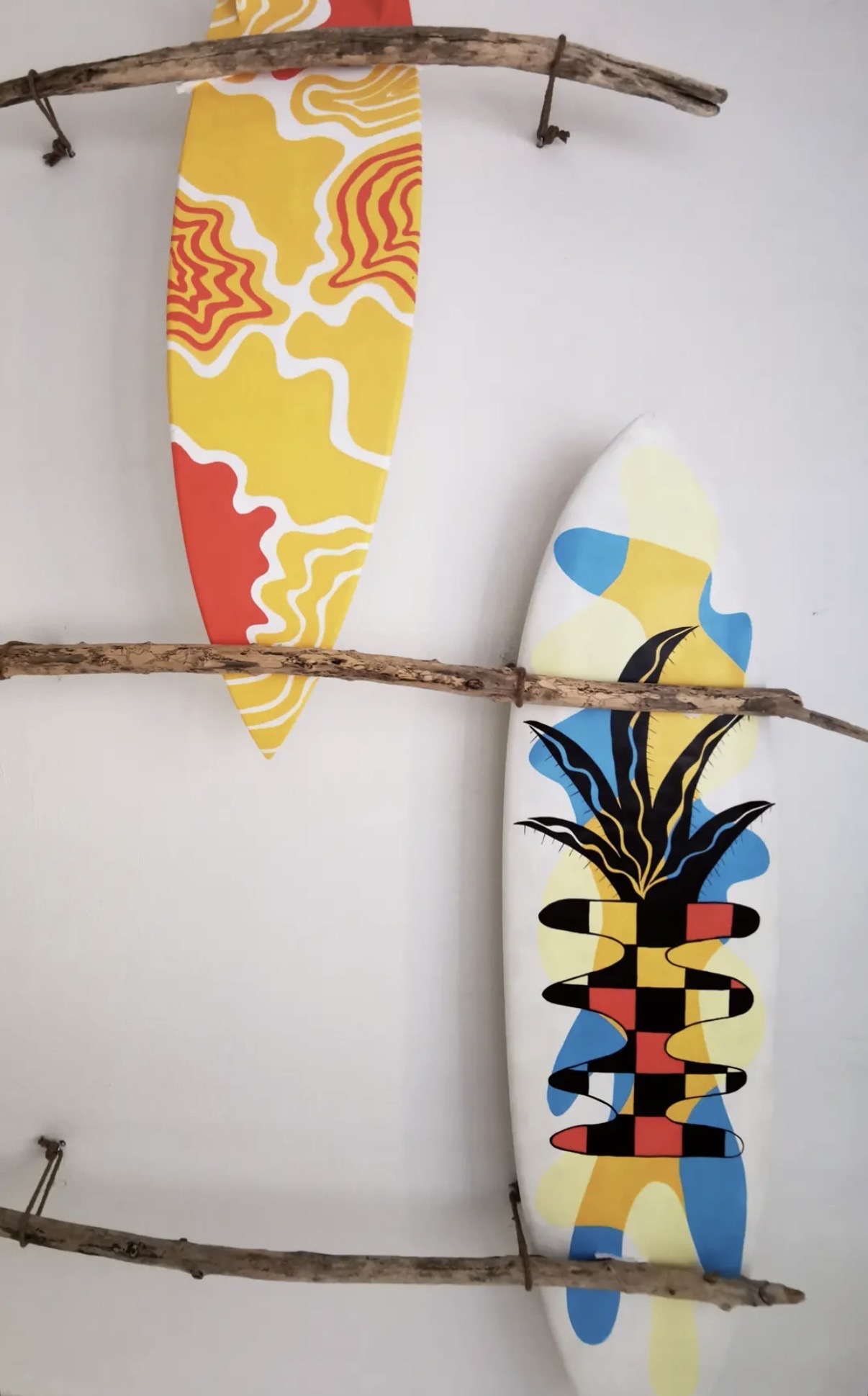 Pour ce projet j’ai récupéré trois planches de surf que j’ai entièrement retravaillées afin de pouvoir dessiner directement sur la matière. Les illustrations s’inspirent de la Côte Basque, du côté jeune et vivant de l’auberge et de l’énergie qui s’en dégage.